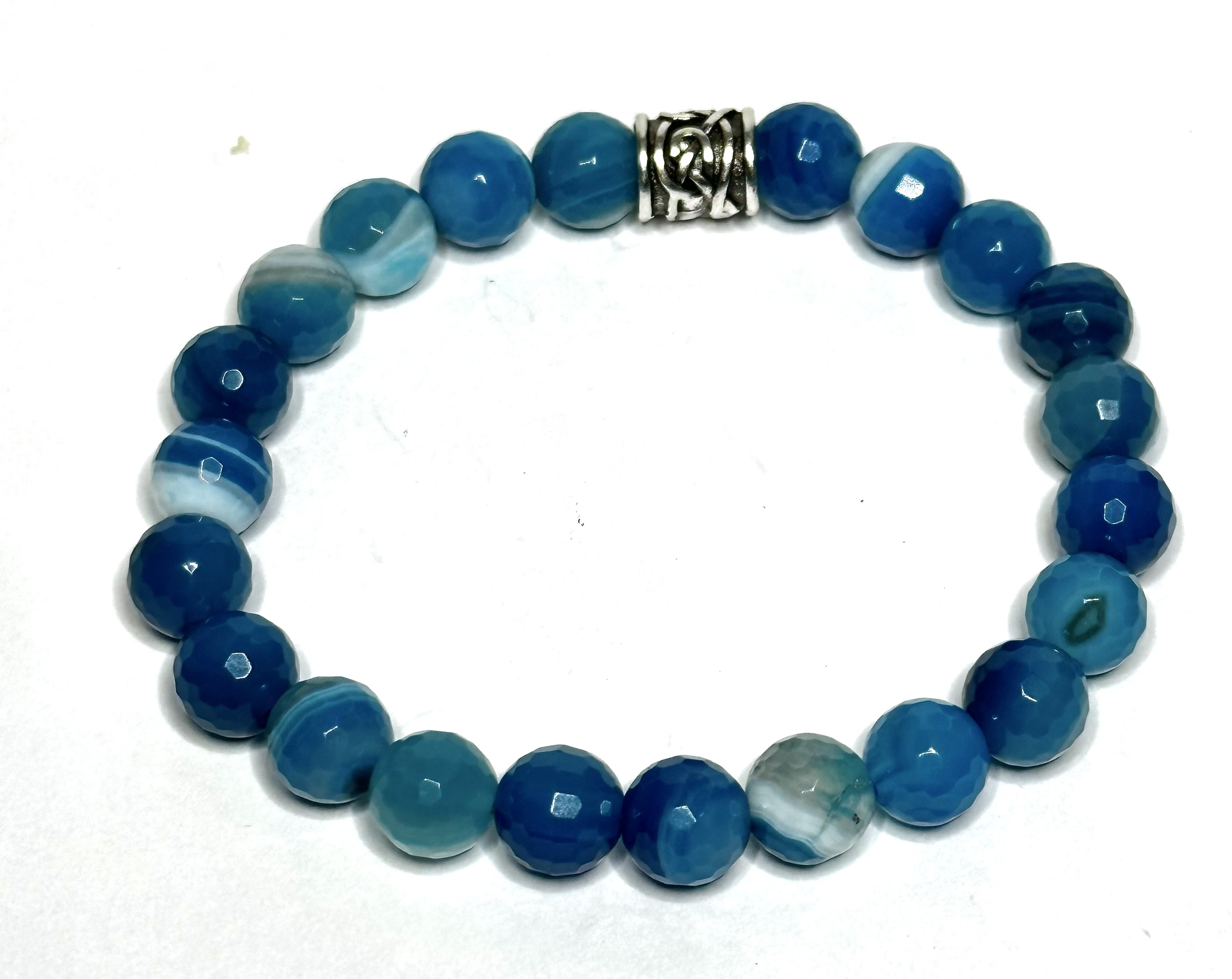 Krásný světle modrý achát bývá kouzelně proužkovaný, nosíval se už za starých časů jako amulet pravdy, který zajišťoval, že z úst vycházejí jen čistá slova. Je uznáván jako nositel míru, spojuje se s utišujícím elementem vody, takže jeho používání vám může pomoci uvolnit se a zbavit stresu.