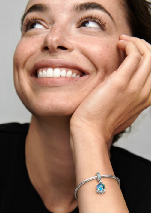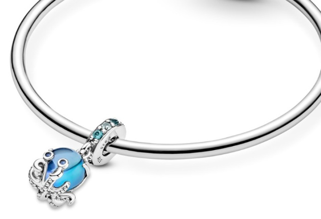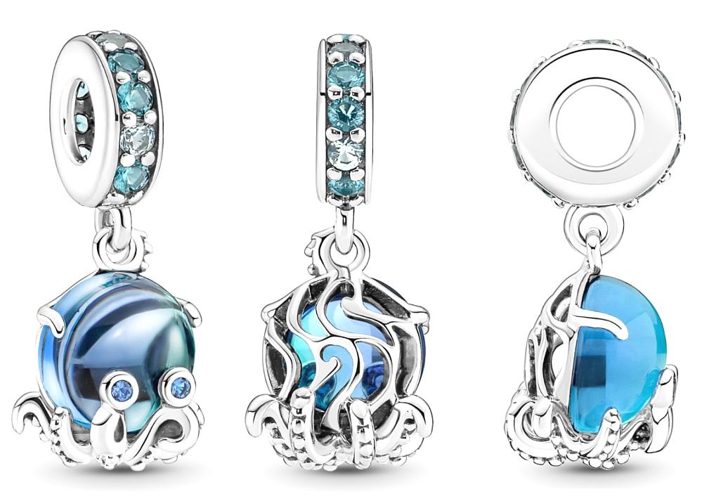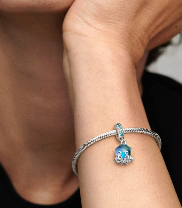 Prozkoumejte nádherný svět modrých mořských hlubin a přidejte si do svých šperků tento roztomilý přívěsek chobotnice. Tento visací přívěsek má krásné dvoubarevné zelené a modré sklo Murano s vlnitým děrovaným vzorem na zadní straně. Chapadla se kroutí a ukazují hravou povahu tohoto přátelského a tajemného mořského tvora. Uměle vyrobené krystaly ve třech odstínech modré barvy dodávají očku a očím chobotnice ještě větší jiskru.