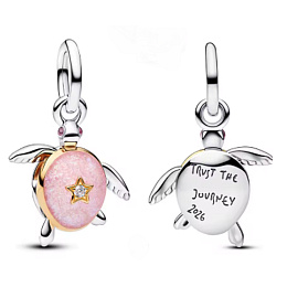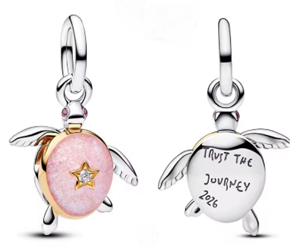 Jemný a symbolický přívěsek ve tvaru želvy je zdoben růžovým kamenem se zlatou hvězdou. Na zadní straně nese inspirativní nápis „Trust the Journey 2026“ – Důvěřuj své cestě.