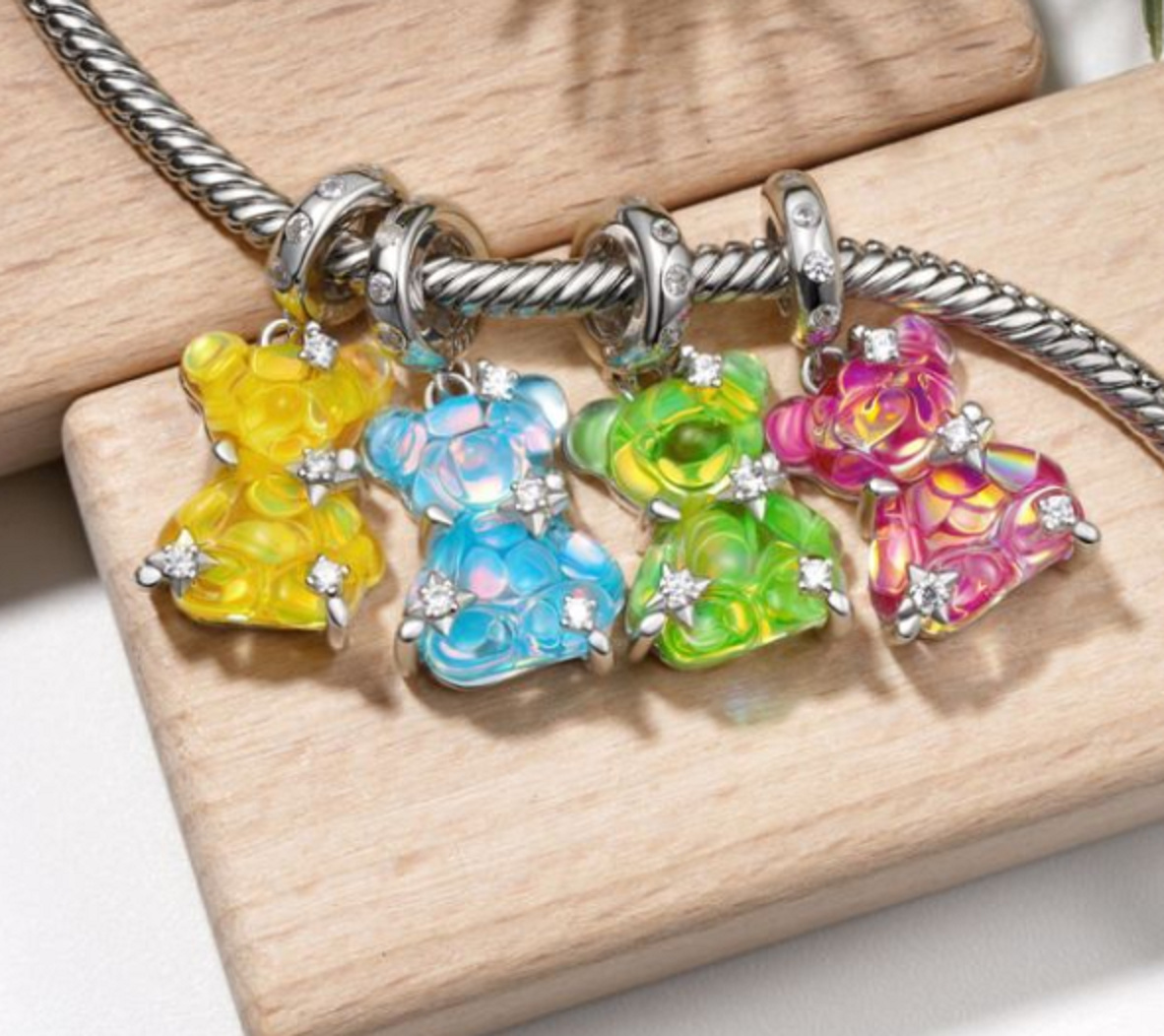 Lesklý povrch a roztomilý vzhled dodávají vašemu náramku osobitý šarm. Tento rozkošný přívěsek obsahuje barevného gumového medvídka zdobeného třpytivými hvězdami pokrytými kameny kubické zirkonie dodává nádech magie a elegance. Nápaditý kousek má okouzlující design a potěší hlavně ženy.