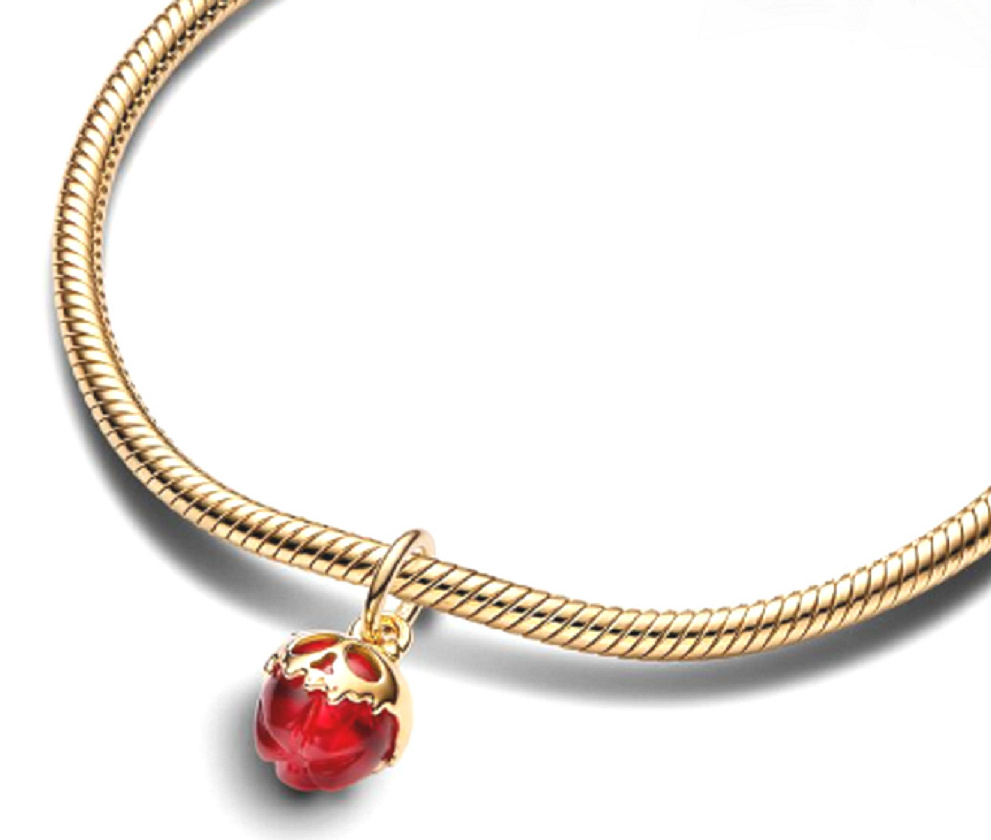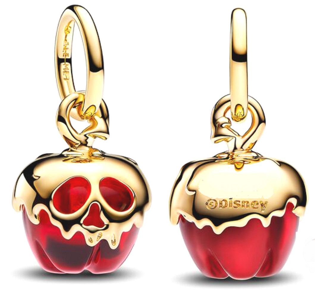 Červené jablko inspirovaným ikonickou královnou zla je jemně pozlacené 14karátovým zlatem. Lákavé jedovaté jablko je vyrobeno z červeného Muránského skla a pokryto zlatým tvarem lebky, což vytváří výrazný kontrast.