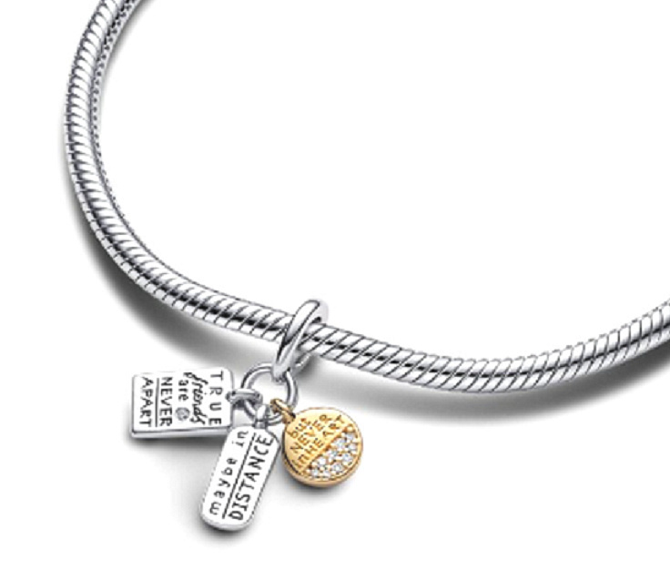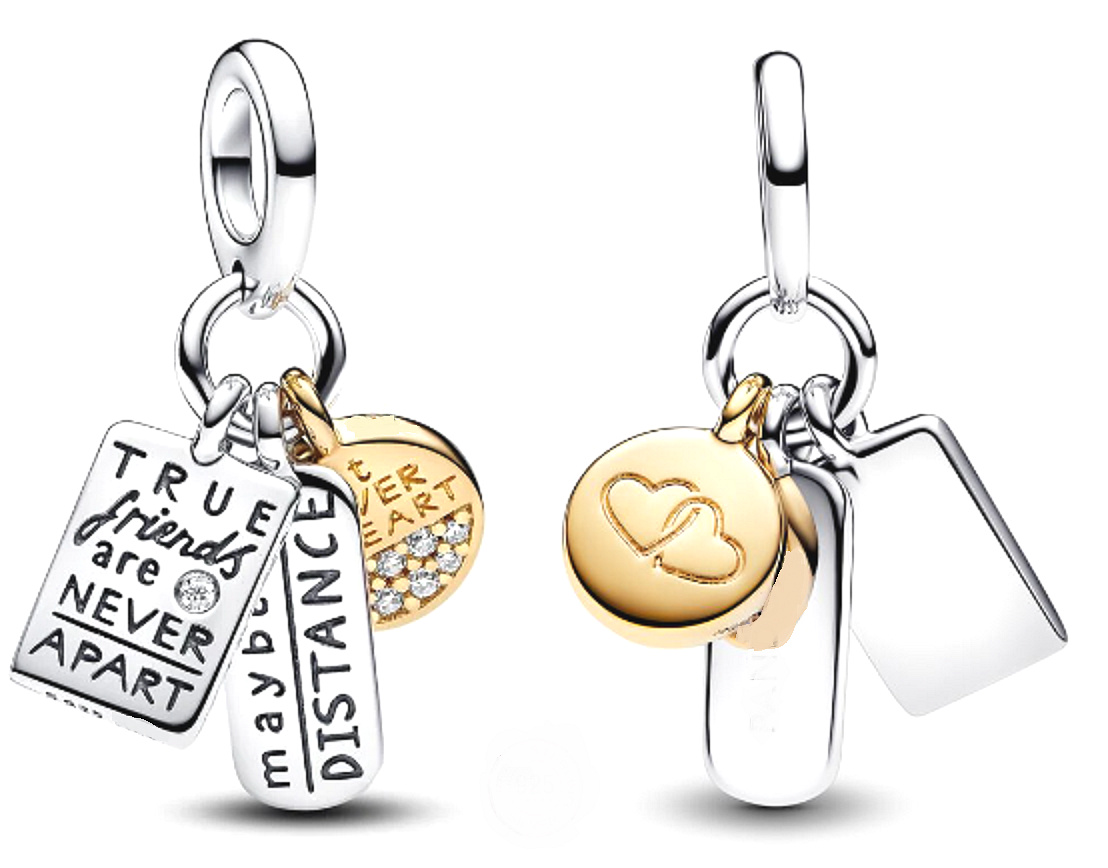 Přítel tě nikdy nenechá dělat bláznivé věci... sám! Pocta vašim věčným přátelům. Toto dvoubarevné kouzlo pro přátele má tři závěsy s rytinami s nápisy „Praví přátelé nejsou nikdy odděleni“, „Možná na DÁLKU“, „ale NIKDY v srdci“, s pavé detaily a dvěma vzájemně propojenými vyrytými srdíčky. Noste ho nebo darujte jako připomínku spojení, které vždy přetrvá, bez ohledu na vzdálenost.