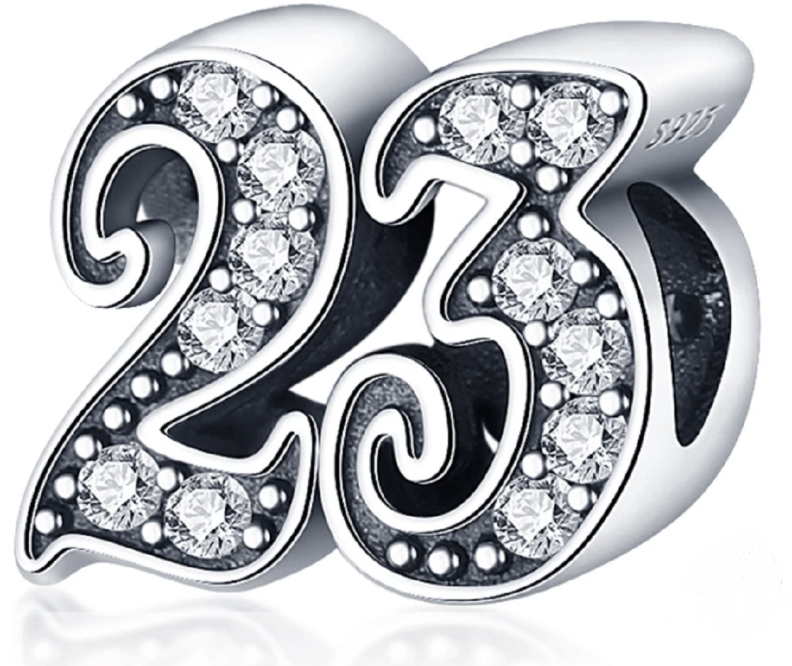 Tento přívěsek pro náramky, vyrobený na oslavu 23. výročí nebo nezbedných 23 narozenin, je zvýrazněn kubickými Zirkony a korálkovými detaily.