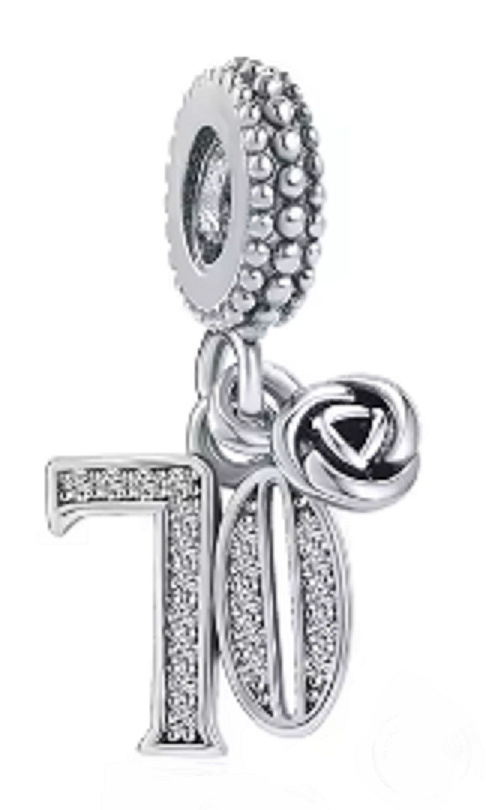 Ať už slavíte 70. výročí nebo narozeniny, s tímto šikovným sedmdesátkovým přívěskem je to pravé. Přívěsek je zvýrazněn Kubickou Zirkonií a detailně zdobený korálky. Noste, nebo sdílejte dílek jako součást svého jedinečného příběhu.