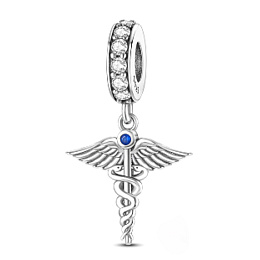 Visací přívěsek s caduceem, symbolem medicíny, sestávající ze dvou hadů propletených na tyči s Andělskými křídly, navržený s modrými a bílými třpytivými drahokamy Zirkonu.