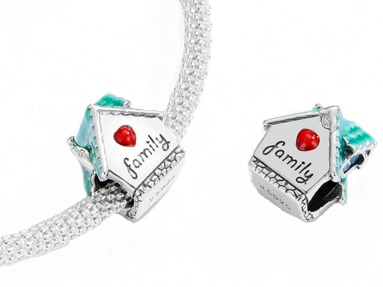 Ten dům, kde bydlí láska, prý není k nalezení, ten dům, kde bydlí láska, určitě daleko není, je vysoko nebo nízko, určitě však blízko, ten dům, kde bydlí láska, musí tu někde být. Korálek ve tvaru domečku s obrázkem šťastné rodiny, zdobený barevným smaltem jistě "oživí" ne jeden náramek.