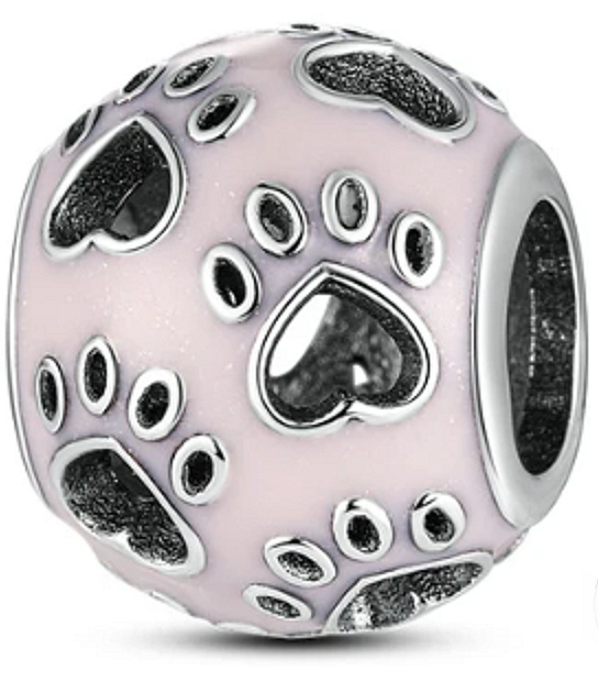 Korálek ve tvaru kuličky je dekorován pacičkami, které jsou vytvořeny srdíčky, dokončen je růžovým smaltem. Tento korálek by neměl chybět na náramku žádného majitele čtyřnohého domácího mazlíčka nebo milovníka zvířátek. Buďte originální, buďte jedinečná!