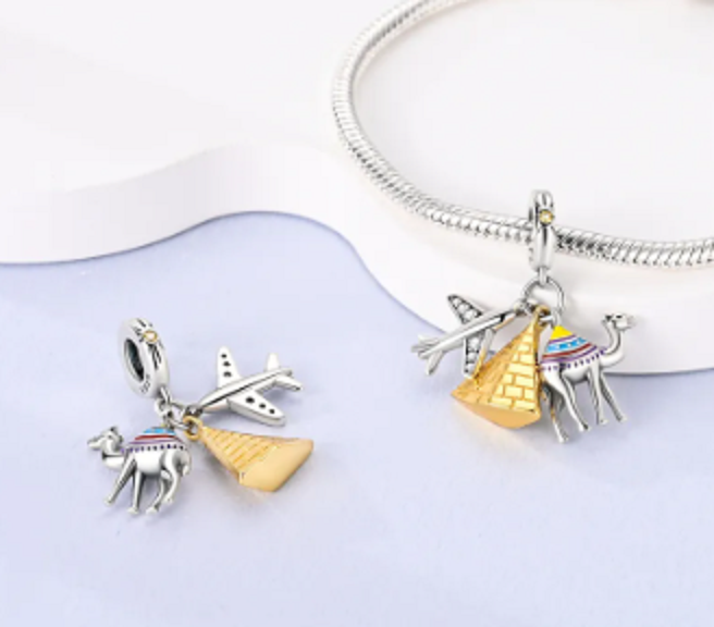 Přívěsek 925 Sterling Silver s Letadlem, pozlacenou pyramidou a velbloudem, dekorován hladkým barevným smaltem a zářivě bílými drahokamy Zirkonu. Na prstenu přívěsku je sluníčko se Zirkonem oranžové barvy. Roztomilý doplněk k vašim cestovatelským příběhům.