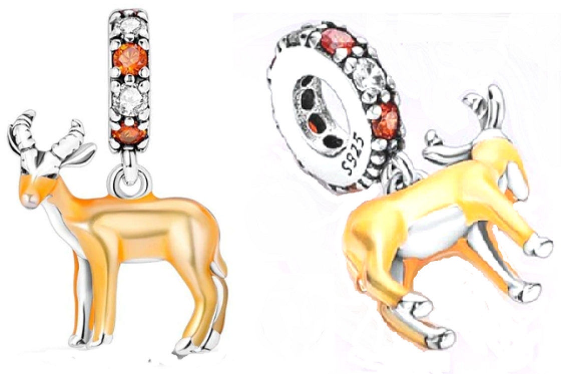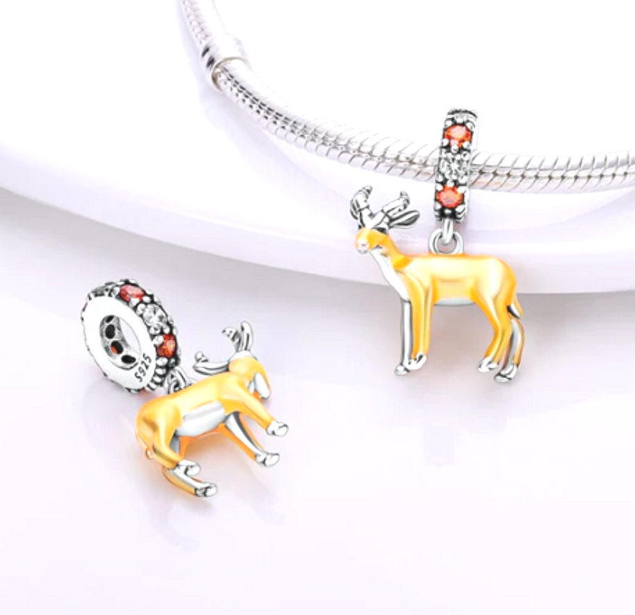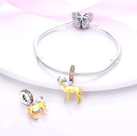 Visací přívěsek s antilopou, dekorovaný hladkým zlatým smaltem a zářivými oranžovými a bílými drahokamy Zirkonu. Antilopy symbolizují energii, moudrost a instinkt. S každým přívěskem vyprávěj svůj příběh a vytvoř si náramek, který odráží, kdo jsi. Tvůj styl. Tvůj náramek. Tvůj příběh.