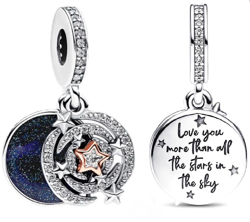 Padá hvězda, přejte si dvojitý visací přívěsek Dvoubarevná padající hvězda. Určitě se stane hitem mezi milovníky dvoubarevných přívěsků. Tento přívěsek s padající hvězdou zdobí gravírovaný text „Love you more than all the stars on the sky“ Miluji tě víc než všechny Hvězdy na nebi a třpytivý modrý smalt, který představuje galaxii plnou třpytivých hvězd. Druhá destička visacího přívěsku má děrovaný vzor padajících hvězd a každá hvězda má za sebou zaoblenou stopu z třpytivých kamenů a kuliček. Řada kamenů na očku dodává přívěsku třpytivý nádech. Dodejte svému všednímu dni mimořádný třpyt nebo inspirujte někoho, koho máte rádi, aby vždy mířil ke hvězdám.