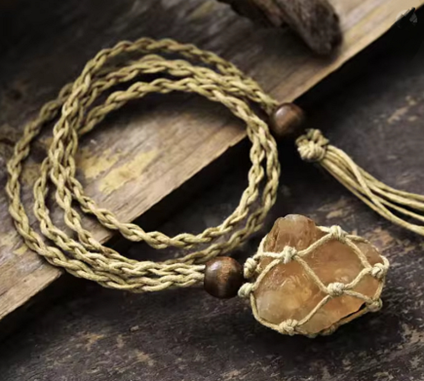 Beschreibung Citrínový náhrdelník v boho stylu – surový kámen hojnosti v ručně pletené síťce
