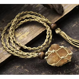 Tento originální náhrdelník z přírodního citrínu zaujme svým zemitým boho stylem a autentickým vzhledem. Surový kámen je zasazen do ručně pletené textilní síťky, která podtrhuje jeho přirozenou krásu a dělá z každého kusu jedinečný šperk. Přírodní šňůrka doplněná dřevěnými korálky a ozdobným zakončením působí harmonicky a přirozeně. Tento náhrdelník není jen doplněk, ale také osobní talisman s hlubokým významem.