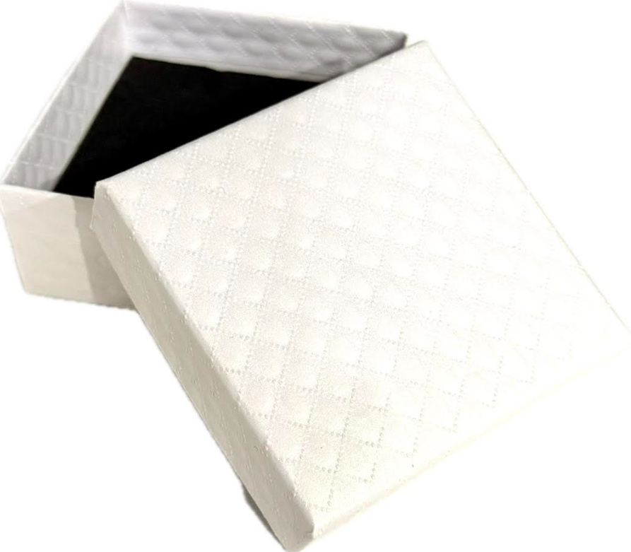 Elegantní bílá krabička na šperky vyrobená z kvalitního texturovaného papíru s jemným vzorem je ideální pro uložení i darování šperků. Díky měkké černé houbičce uvnitř zajistí bezpečné uložení a krásně zvýrazní každý šperk.