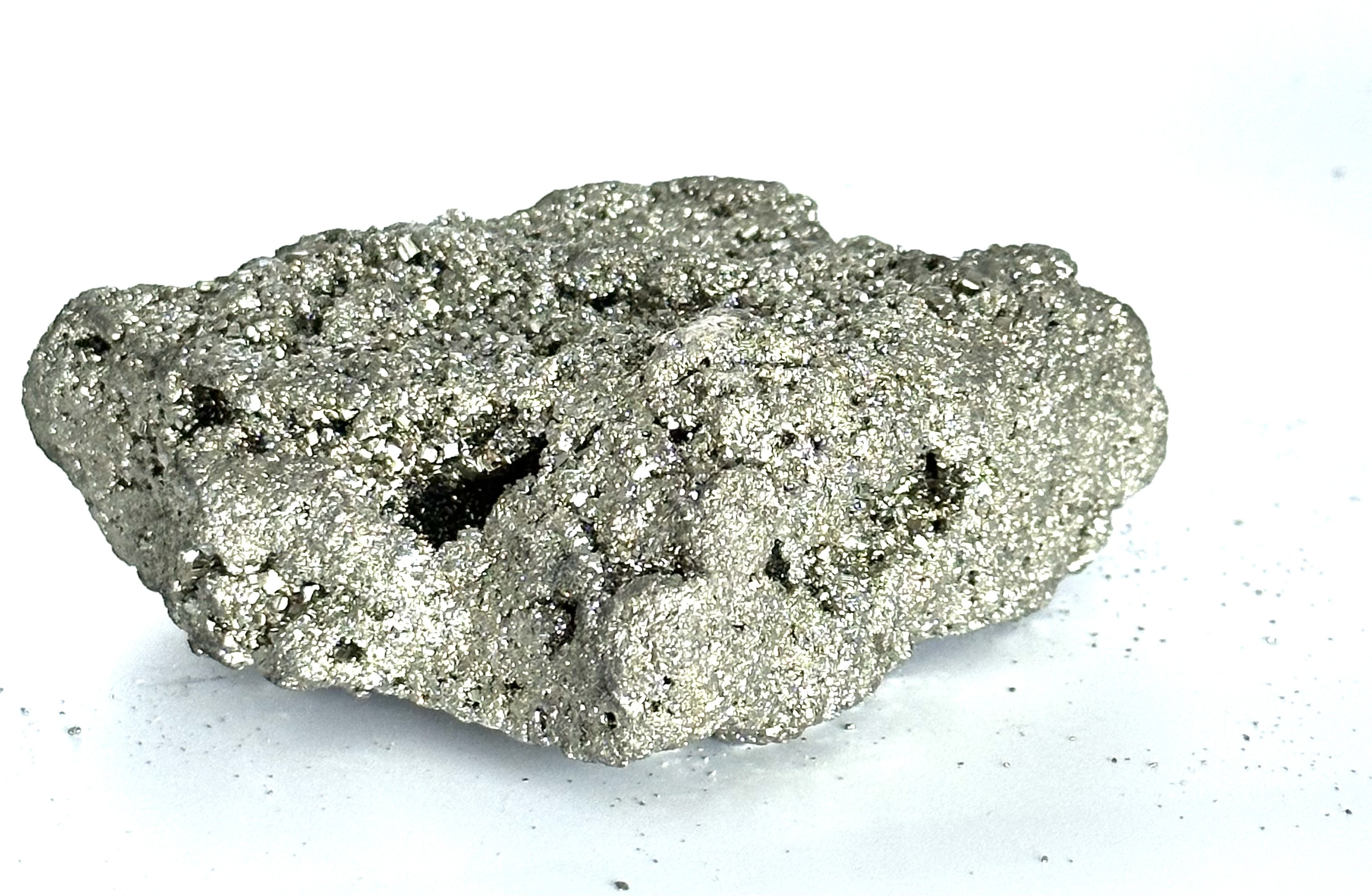 Ein sehr ästhetisches Mineral mit regelmäßigen kubischen Kristallen, die bis zu mehreren Dezimetern groß werden können. Pyrit ist bei Sammlern wegen seiner messinggelben Farbe und seines hohen metallischen Glanzes sehr beliebt. Es wird manchmal auch als "Katzengold" bezeichnet, weil es in der Vergangenheit oft mit diesem Edelmetall verwechselt wurde. Seine Vorkommen sind auf der ganzen Welt zu finden, die schönsten jedoch in Peru - demselben Herkunftsland wie unsere Steine. Von der chemischen Zusammensetzung her ist es ein Eisendisulfid.