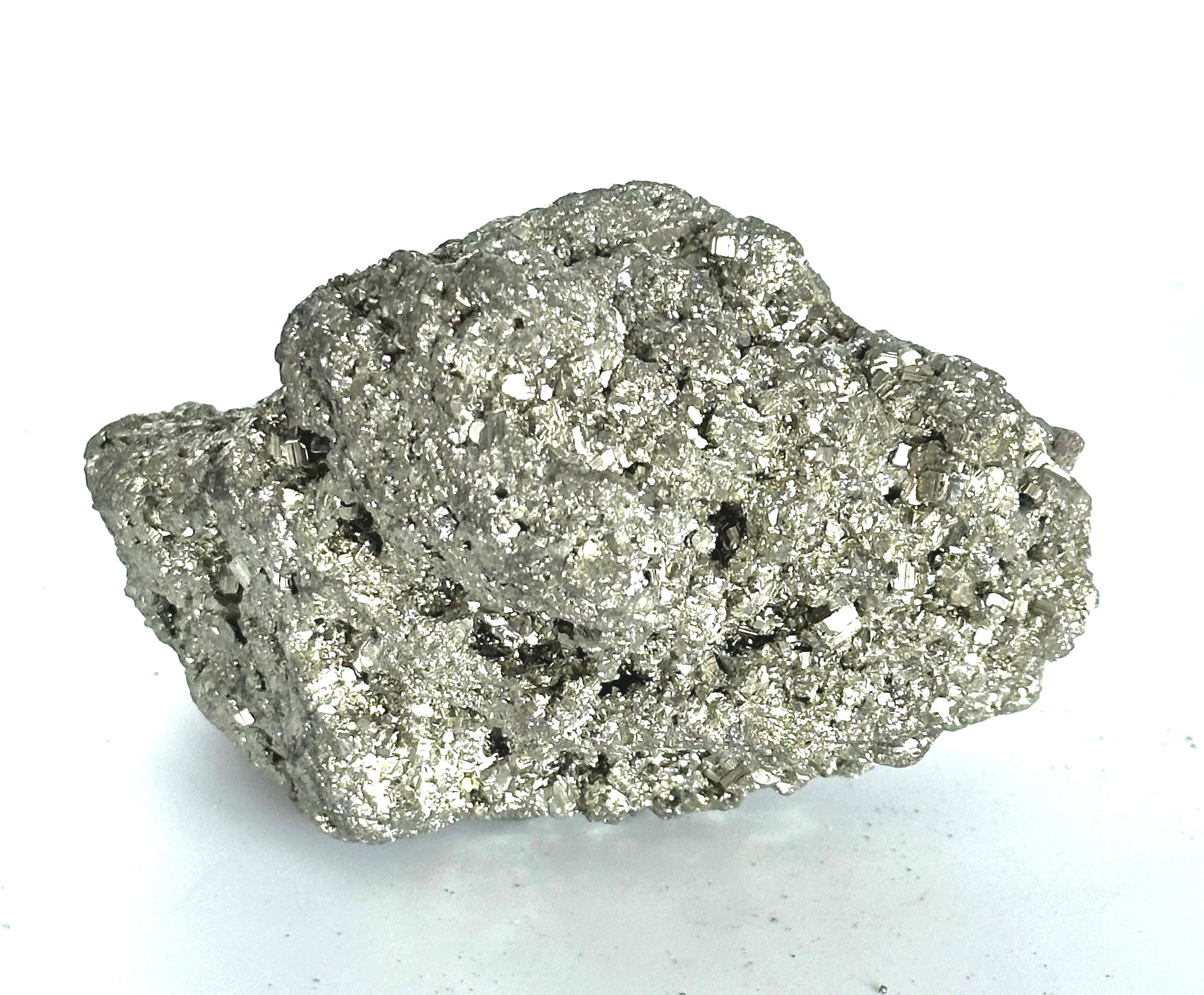 Ein sehr ästhetisches Mineral mit regelmäßigen kubischen Kristallen, die bis zu mehreren Dezimetern groß werden können. Pyrit ist bei Sammlern wegen seiner messinggelben Farbe und seines hohen metallischen Glanzes sehr beliebt. Es wird manchmal auch als "Katzengold" bezeichnet, weil es in der Vergangenheit oft mit diesem Edelmetall verwechselt wurde. Seine Vorkommen sind auf der ganzen Welt zu finden, die schönsten jedoch in Peru - demselben Herkunftsland wie unsere Steine. Von der chemischen Zusammensetzung her ist es ein Eisendisulfid.