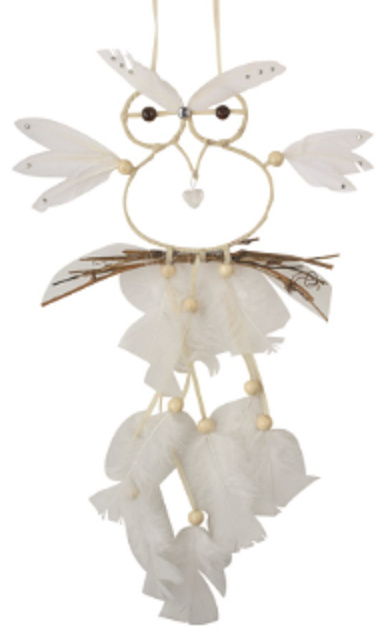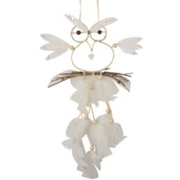 Elegantní závěsná dekorace ve tvaru Sovy v jemných přírodních tónech může sloužit nejen jako originální bytový doplněk, ale také jako lapač snů inspirovaný symbolikou moudrosti, ochrany a vnitřního klidu.