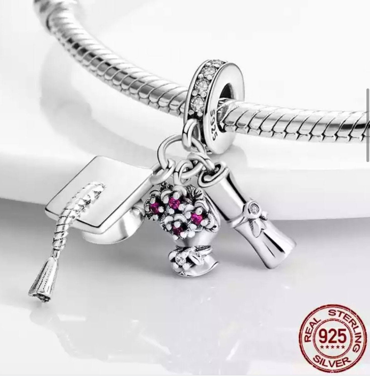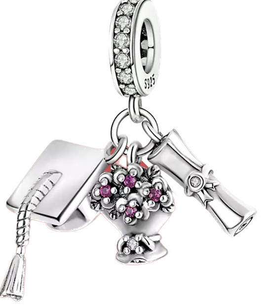 Visací přívěsek s promoční čepicí, diplomem zdobeným bílým třpytivým zirkonovým drahokamem a kyticí květin navrženou s růžovými a bílými třpytivými Zirkony. Prsten obsahuje bílé třpytivé drahokamy, které odpovídají těm na diplomu a kytici.