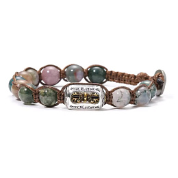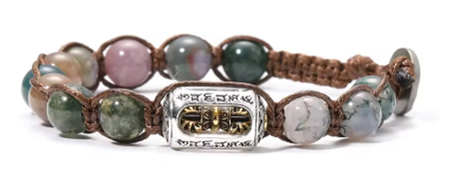 Korálky z achátu o velikosti 8 mm v jemných přírodních odstínech působí harmonicky, elegantně a snadno se kombinují s jakýmkoliv stylem. Každý kámen je originál, což dodává náramku jedinečný charakter. Středovým prvkem je tibetský váleček o velikosti 9 × 17 mm, zdobený symbolem vadžry (dorje). Tento prvek není pouze dekorací – představuje ochranu, vnitřní sílu a jasnost mysli. Funguje jako energetický střed náramku, který pomáhá udržet rovnováhu i v náročných situacích.