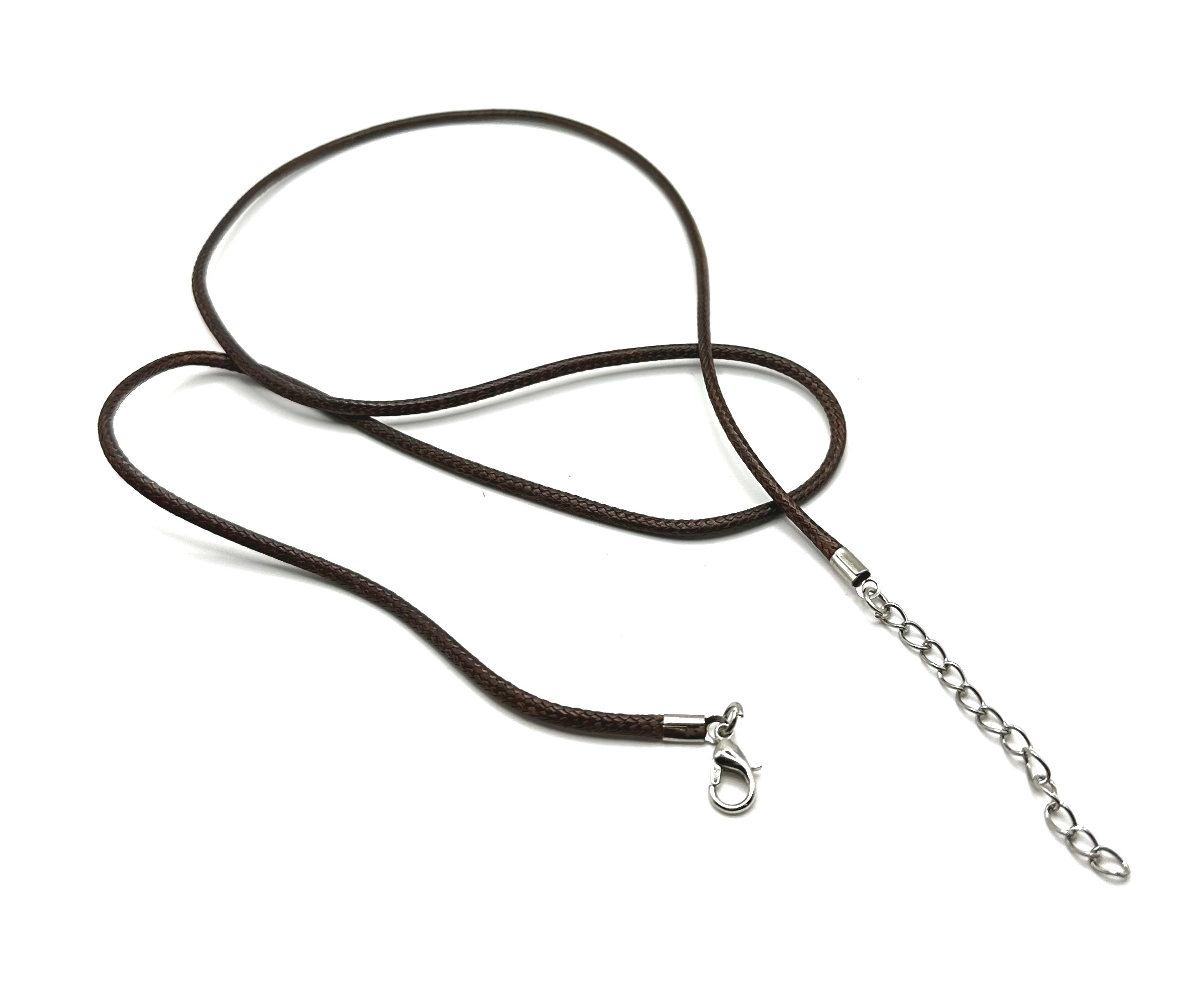 Bavlněná šňůrka, která je povrchově ošetřené voskováním a s hotovým připevněným zapínáním. Stačí pouze navléct přívěsek a vyrazit. Samozřejmostí tohoto hotového výrobku je prodlužovací řetízek. Délka 60 cm + 5 cm adjustační řetízek. Karabinka 7 x 12 mm, šňůra průměr 2 mm.